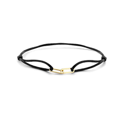 Deze armband is gemaakt van zwart zijdekoord met twee 14k geelgouden schakels. De bijzondere materiaalcombinatie geeft de armband een eigentijdse uitstraling en hij matcht prachtig met andere armbanden uit onze collectie