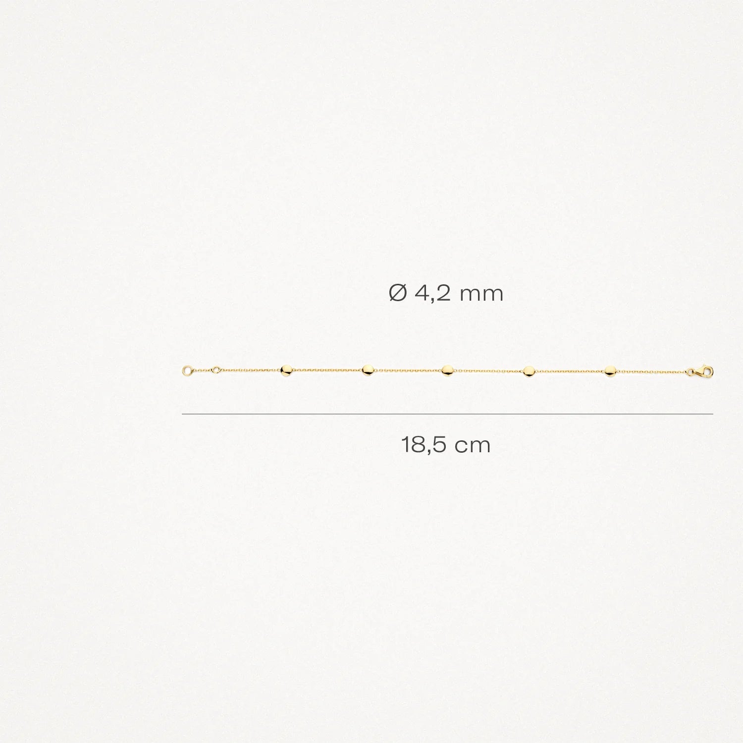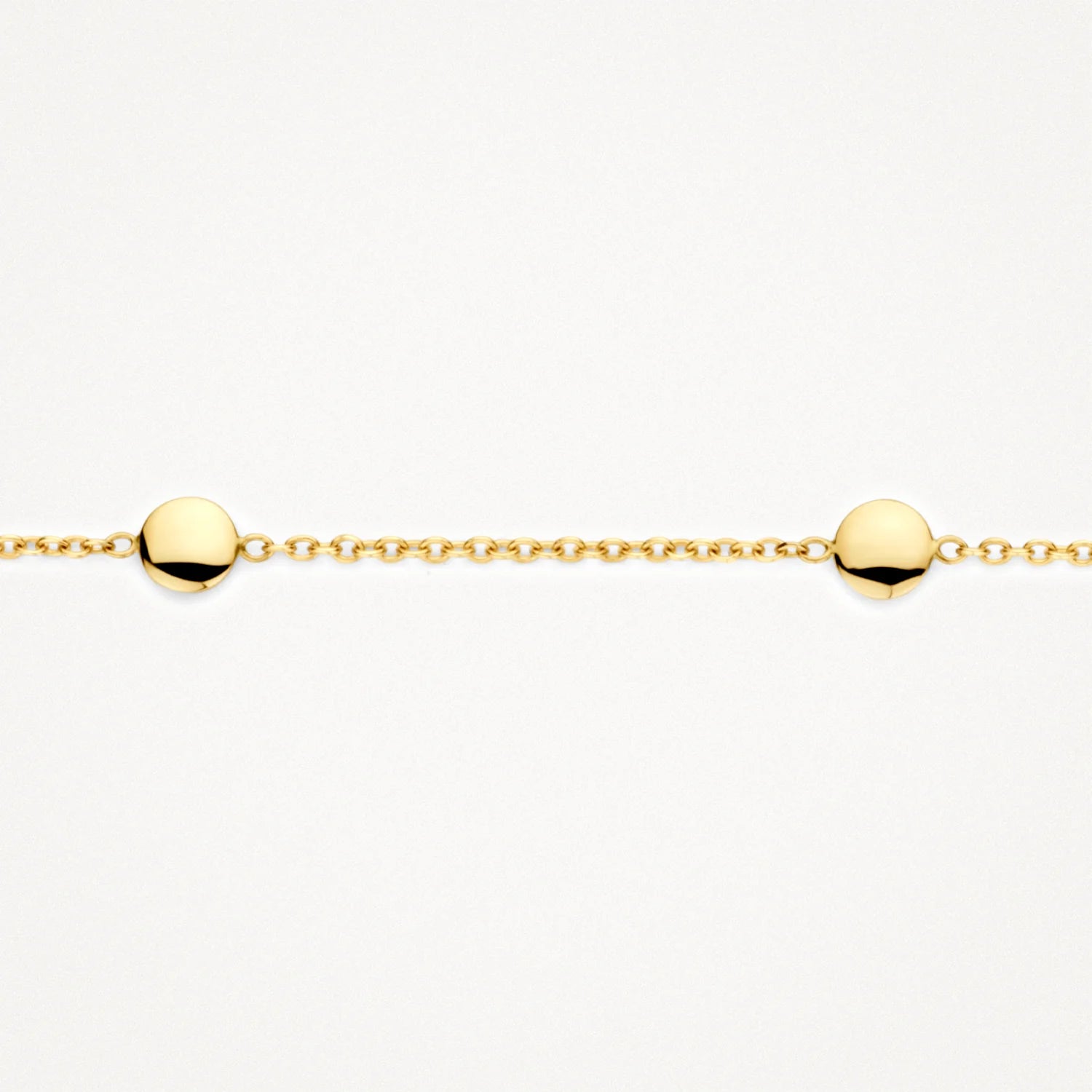 De gladgepolijste rondjes aan deze 14k geelgouden armband met ankerschakels maken deze armband tot een stijlvolle eyecatcher. De totale lengte is 18,5 cm en de armband heeft een karabijnsluiting. Prachtig op zichzelf of in combinatie met andere armbanden uit onze collectie.