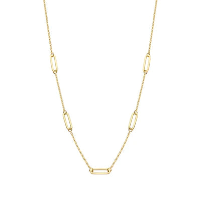 Dit elegante collier bestaat uit fijne schakeltjes afgewisseld met grotere langwerpige schakels. Het collier is gemaakt van 14k geelgoud en heel goed te combineren met andere sieraden uit onze collectie. Bijvoorbeeld met armband 2179YGO.