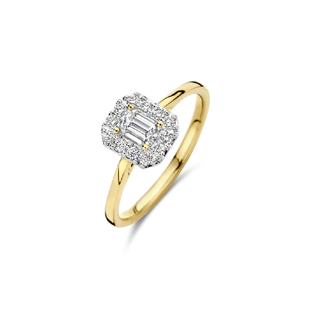 14 karaats goud solitair ring met emerald en briljant geslepen diamanten. Deze klassieker is ook een perfecte aanzoeksring.