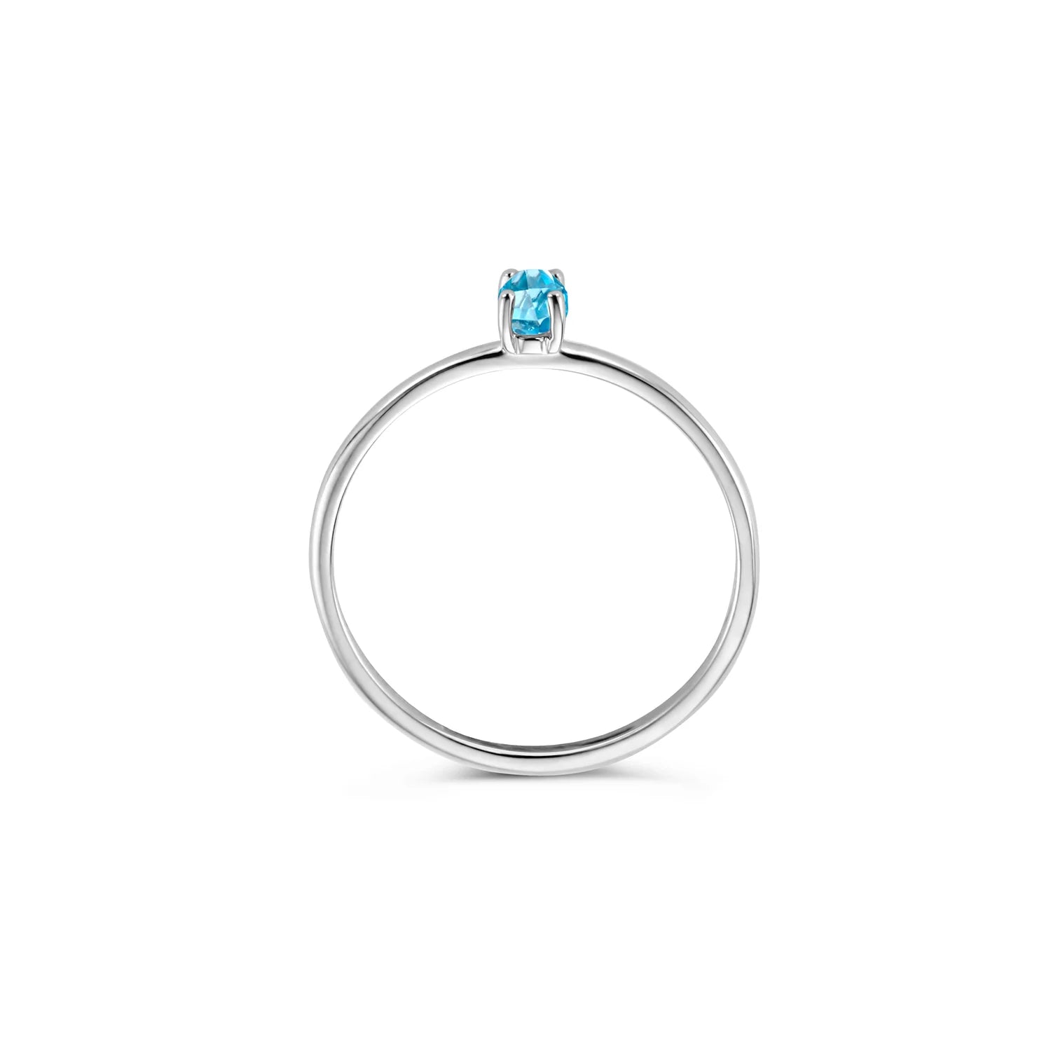 Een ovaalvormige, blauwe topaas siert deze elegante ring gemaakt van 14k witgoud. De band is 1.4 mm breed. Deze elegante eyecatcher doet het goed op zichzelf maar matcht ook prachtig met andere ringen uit onze collectie.