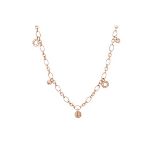 Collier van bewerkte schakels met paar mini diamant hangertjes eraan gestrooid. Bron meets boho.