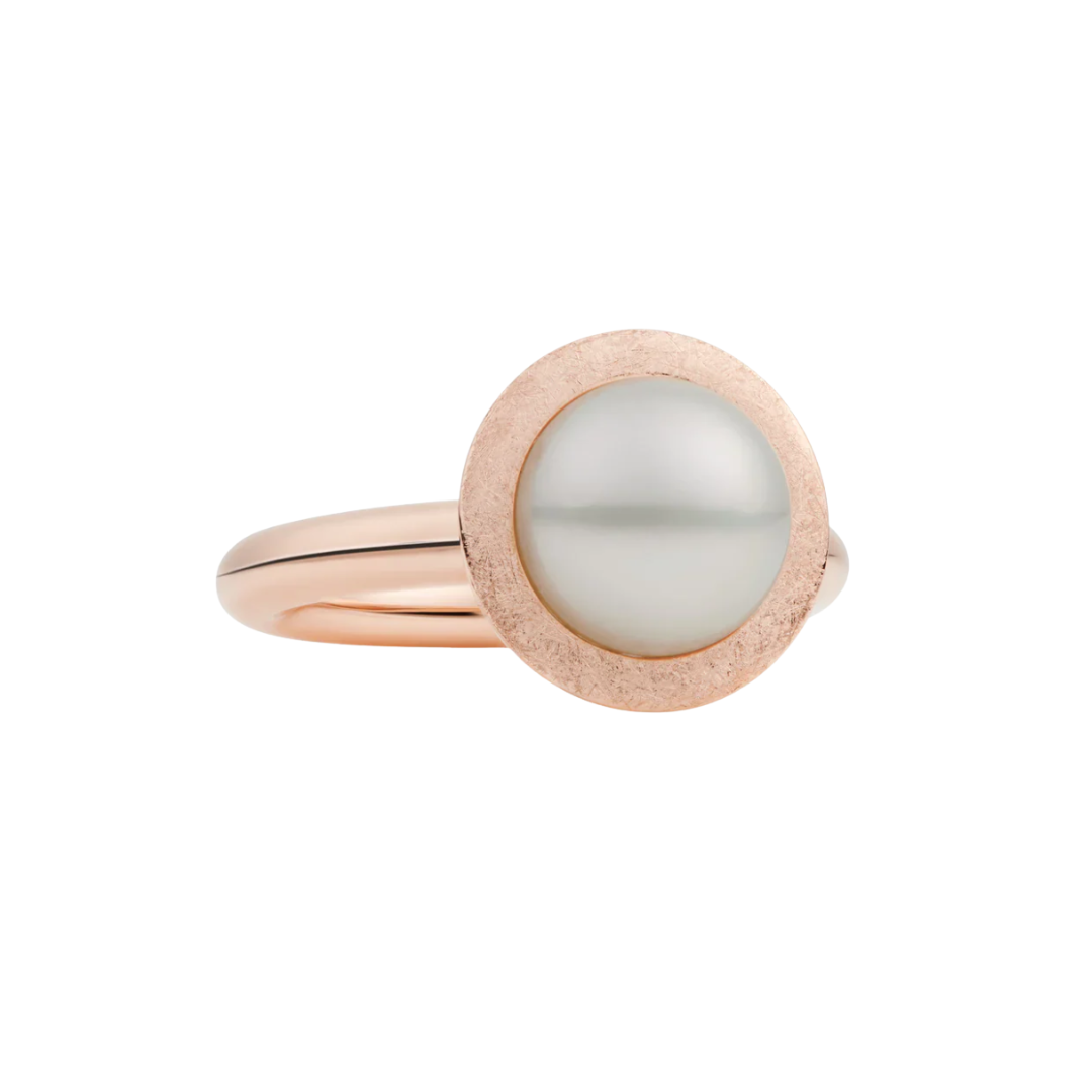 Een zeldzame witte Zuidzeeparel wordt stevig vastgehouden door dit Sushi ringmontuur. De rand om de parel is gesatineerd.