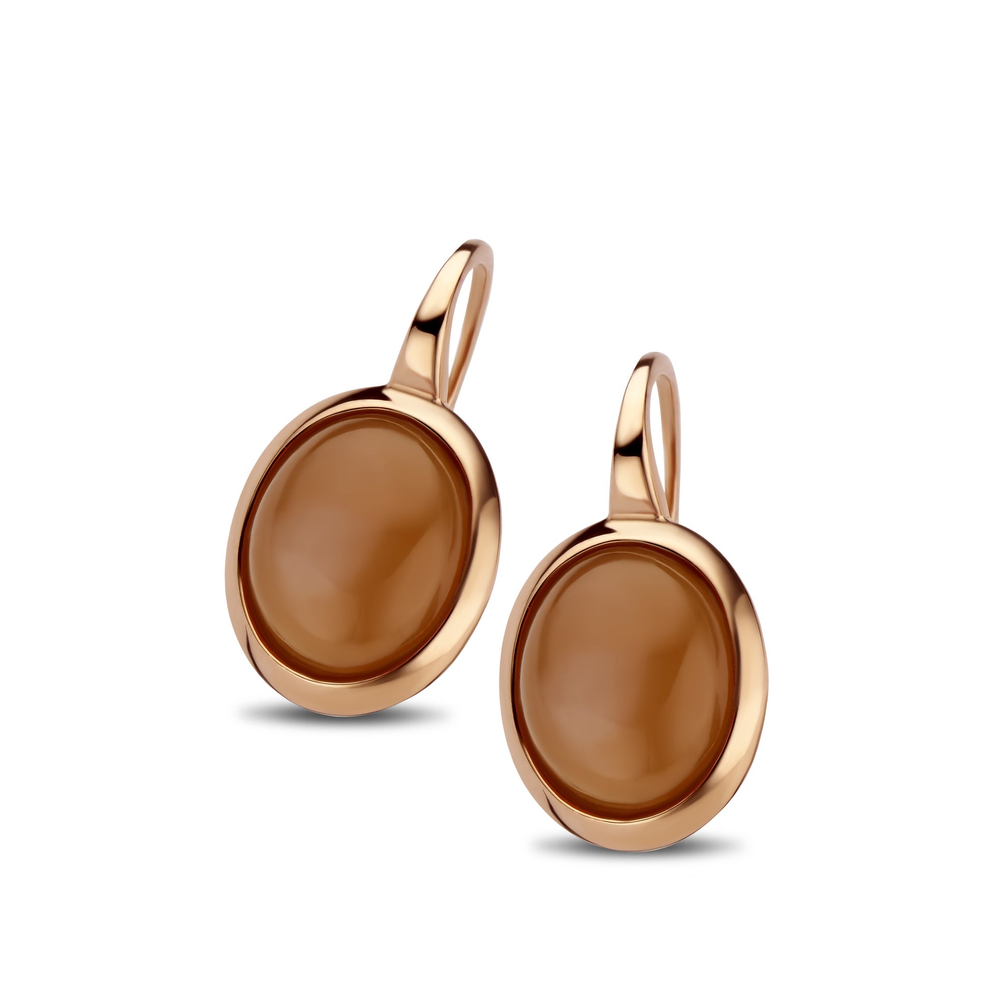 14 krt. Rosegouden oorsieraden met een ovale cabochon geslepen licht-bruine maansteen.