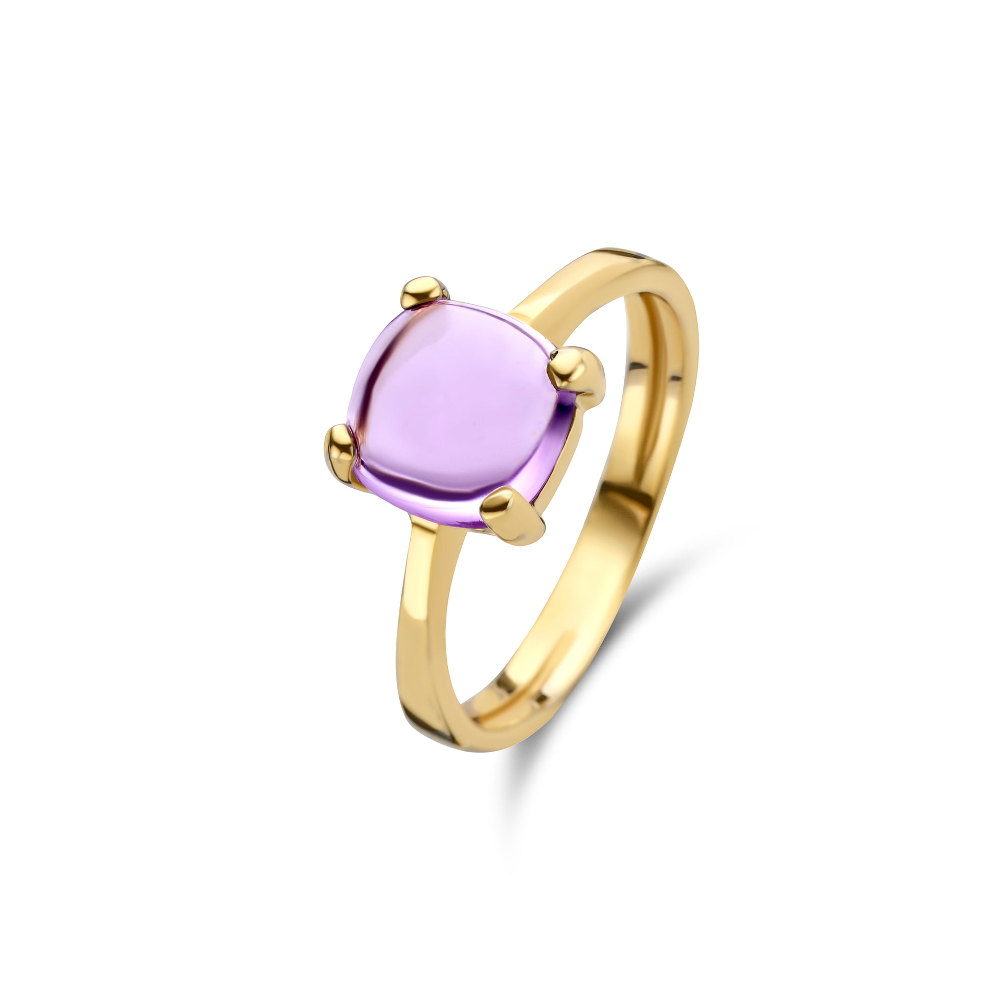 14 krt. geelgouden ring met een vierzijdige cabochon geslepen Amethist. ook mogelijk met blauwe topaas, carneool, citrien, lemonkwarts, peridot, rookkwarts of rozenkwarts.