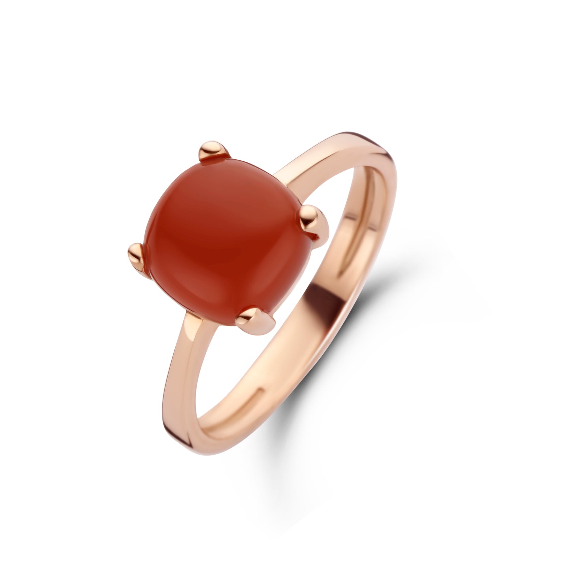 14 krt. roségouden ring met een vierzijdige cabochon geslepen carneool ook mogelijk met een citrien, lemonkwarts, peridot, paarse amethist, rookkwarts of rozenkwarts.