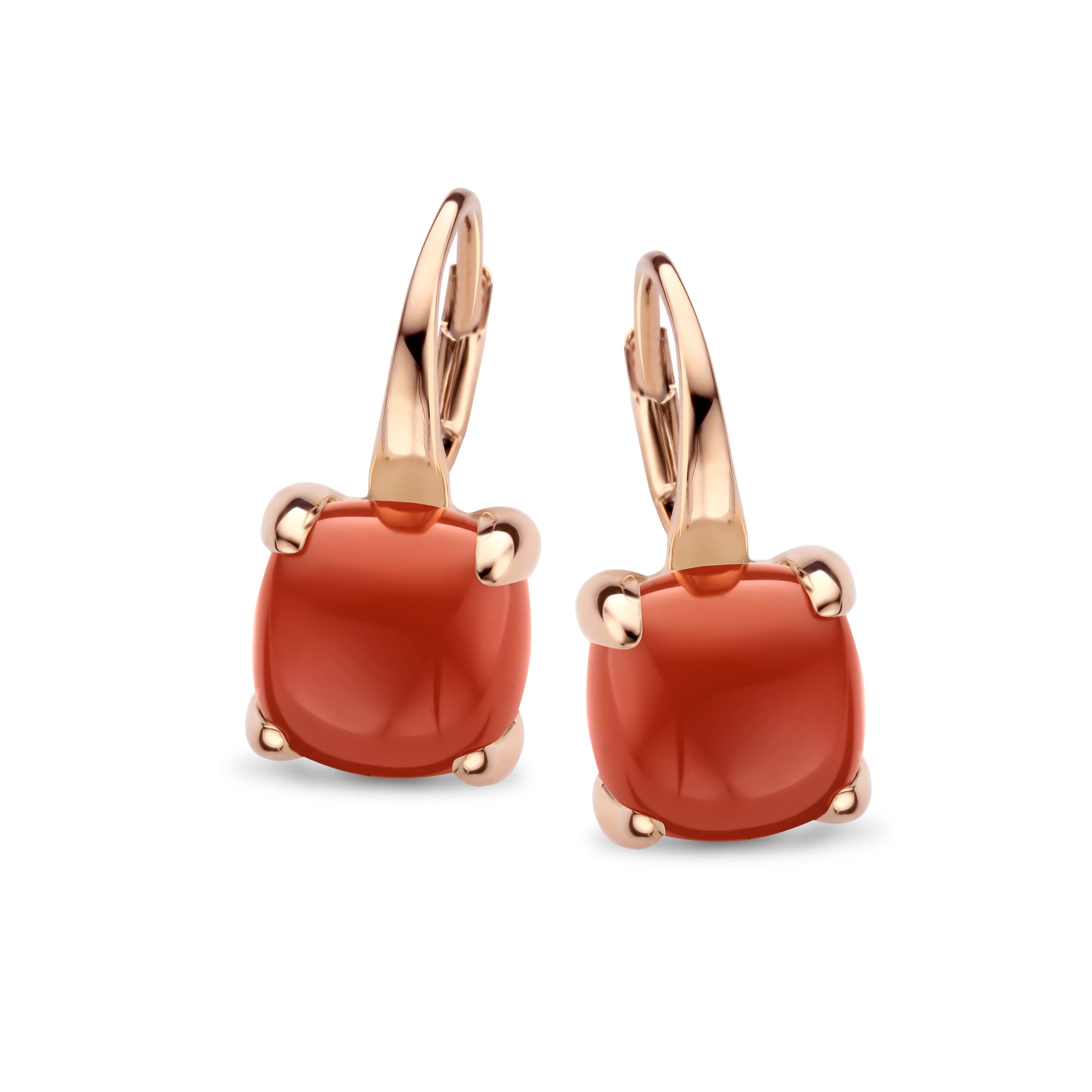 Rosé gouden oorsieraden met een vierzijdige cabochon geslepen edelsteen. Uitgevoerd met carneool ook mogelijk met london blue topaas, paarse amethist, witte maansteen, doublet-edelstenen met groene jade, aquamarijn, robijn en rutielkwarts met witte of grijze parelmoer.