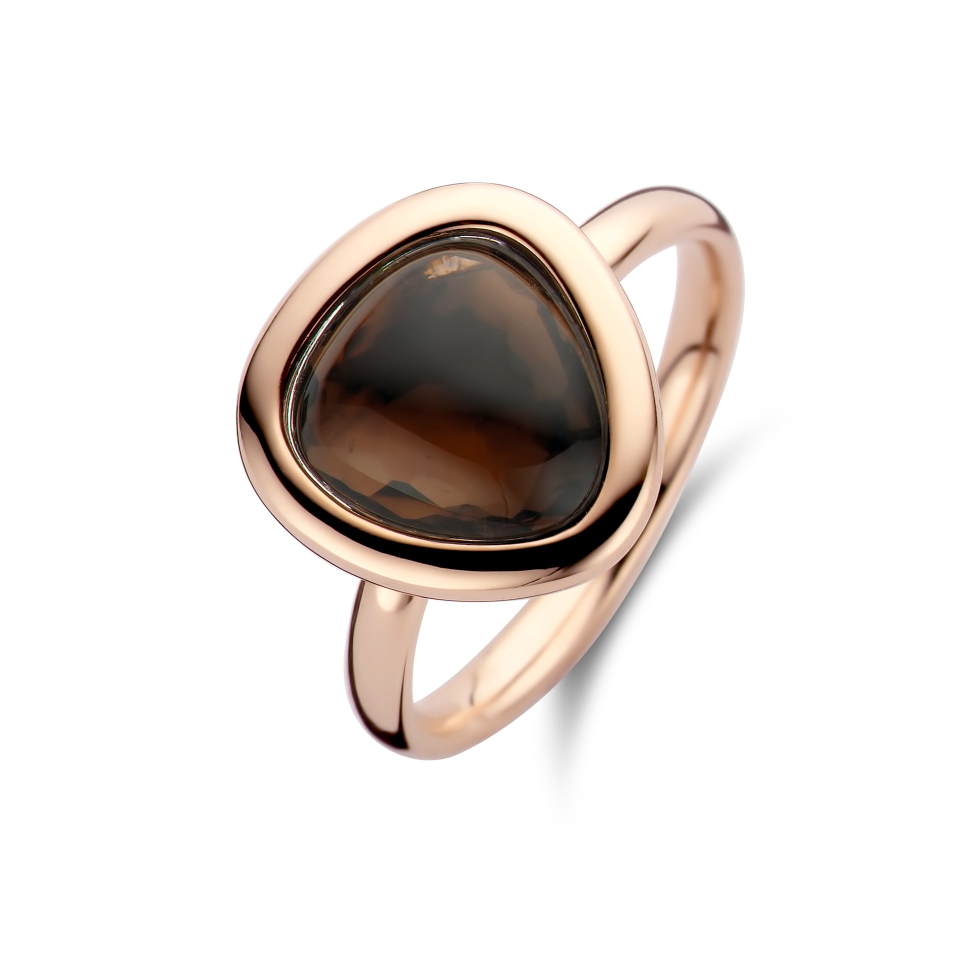 Een rosé gouden ring met een driezijdige cabochon geslepen edelsteen. Uitgevoerd met rookkwarts. Ook mogelijk met blauwe topaas, carneool, madeira of citrien.