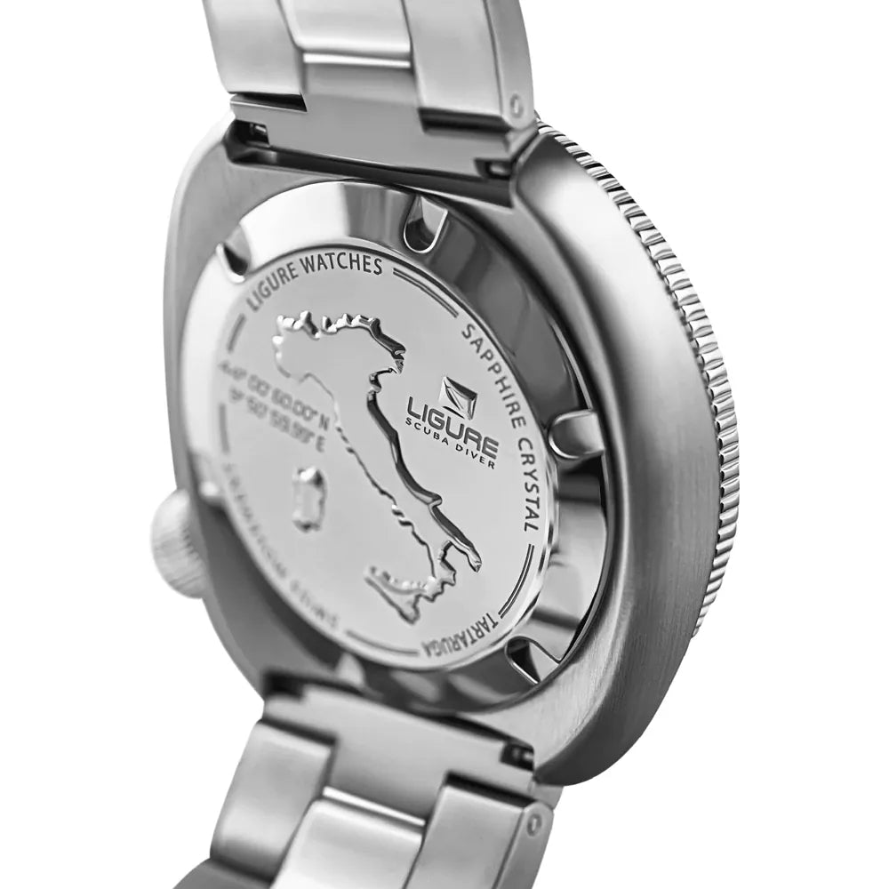 Dit Ligure horloge heeft een kast gemaakt van Roestvrijstaal met een diameter van 41 mm en is voorzien van een metalen band. In de kast bevindt zich een Sellita kwaliteitsuurwerk en is afgewerkt met Saffierglas.