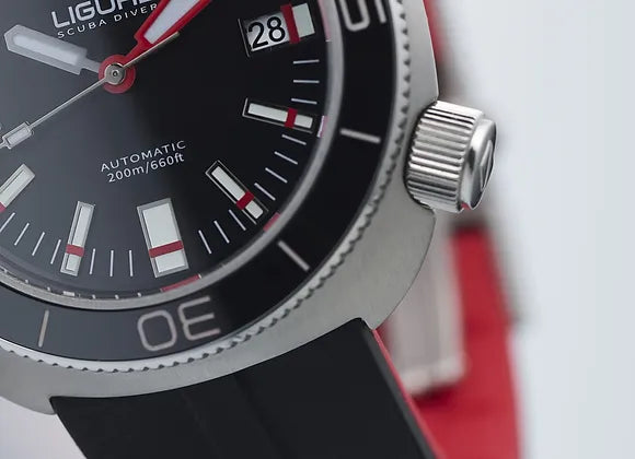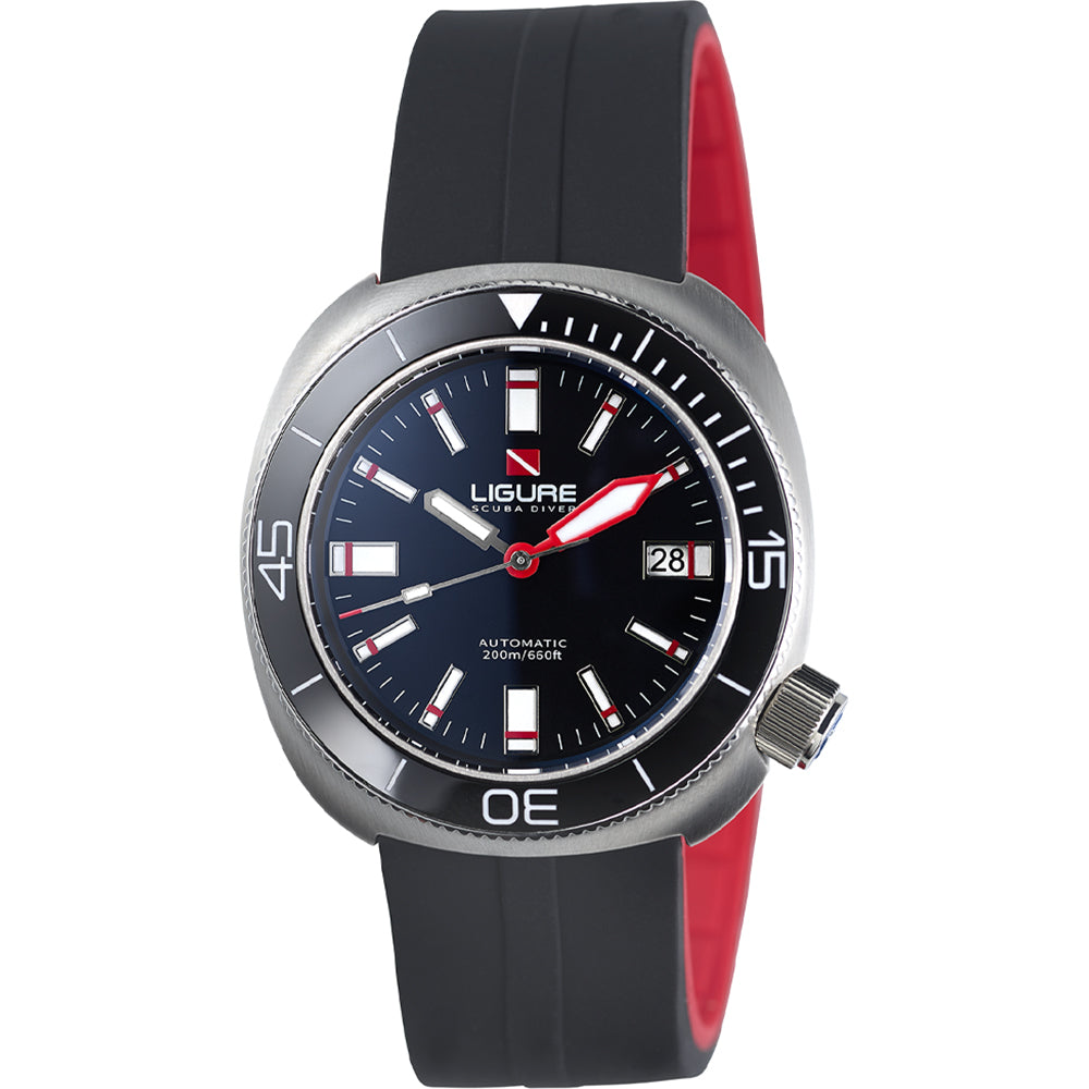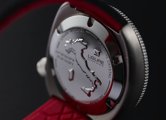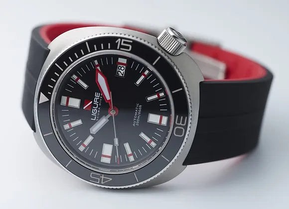 Dit horloge wordt geleverd met een extra leren band, sleutelhanger, poetsdoekje en reisetui. Dit Ligure horloge heeft een Roestvrijstaal kast met een diameter van 41 mm en is voorzien van een Rubber band. In de kast bevindt zich een Sellita kwaliteitsuurwerk en is afgewerkt met Saffierglas. Het horloge is 20ATM. Dit betekent dat het horloge geschikt is voor diepzeeduiken.