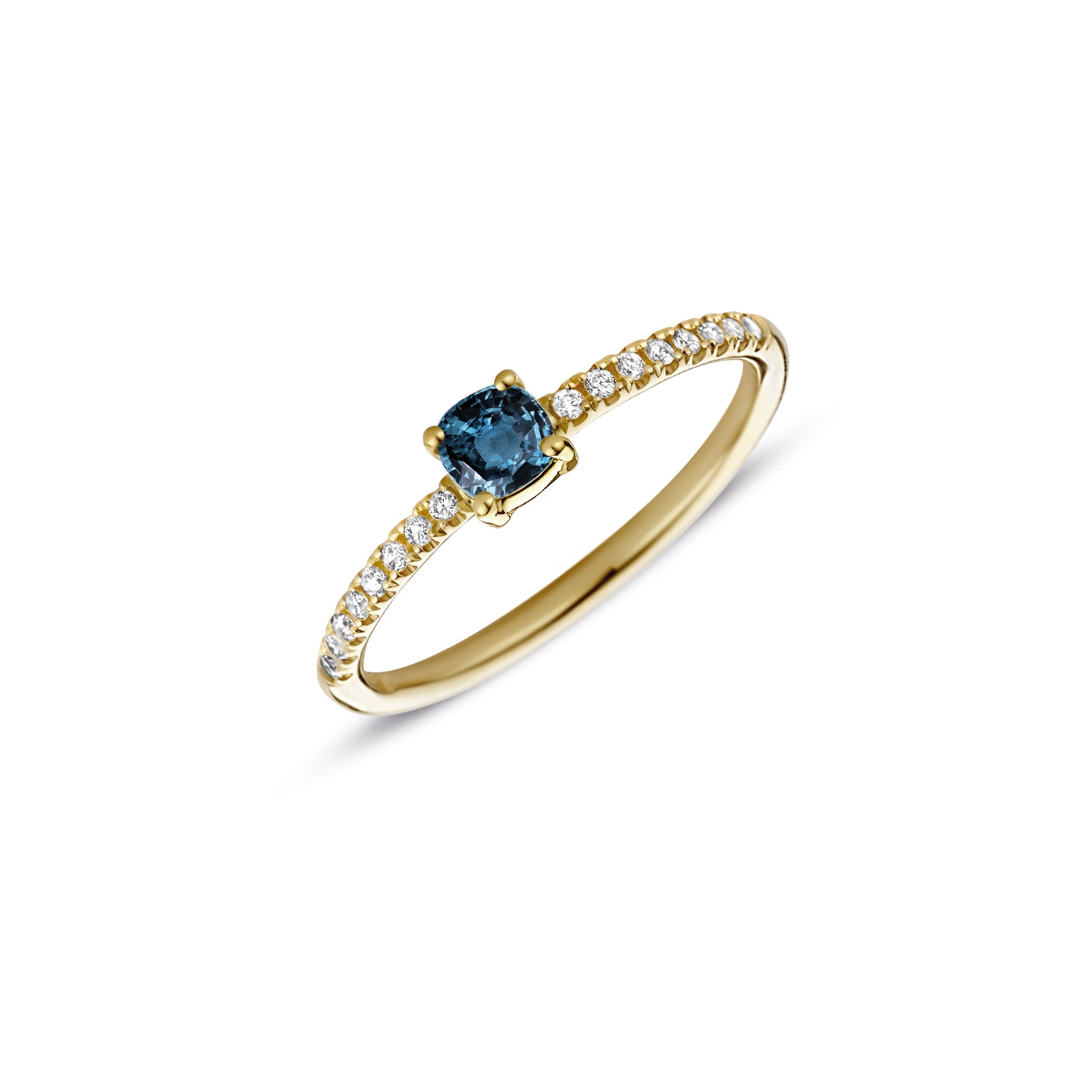 Ring Brilliantly Cushion LBT DI 14kts goud met London blue topaz, met briljant 16/0.12ct pikée/wesselton