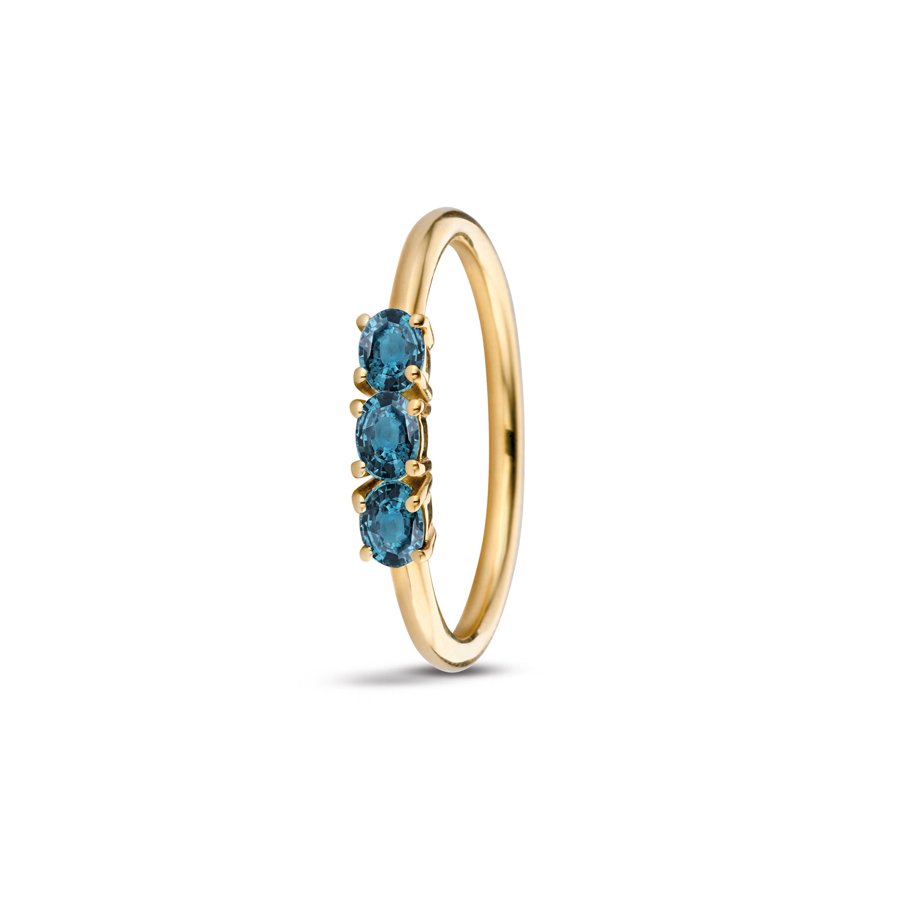 Deze schitterende ring van Miss Spring is een geelgouden ring met 3 Londen Blue topaas edelstenen. Dit model is van de allerliefste collectie.
